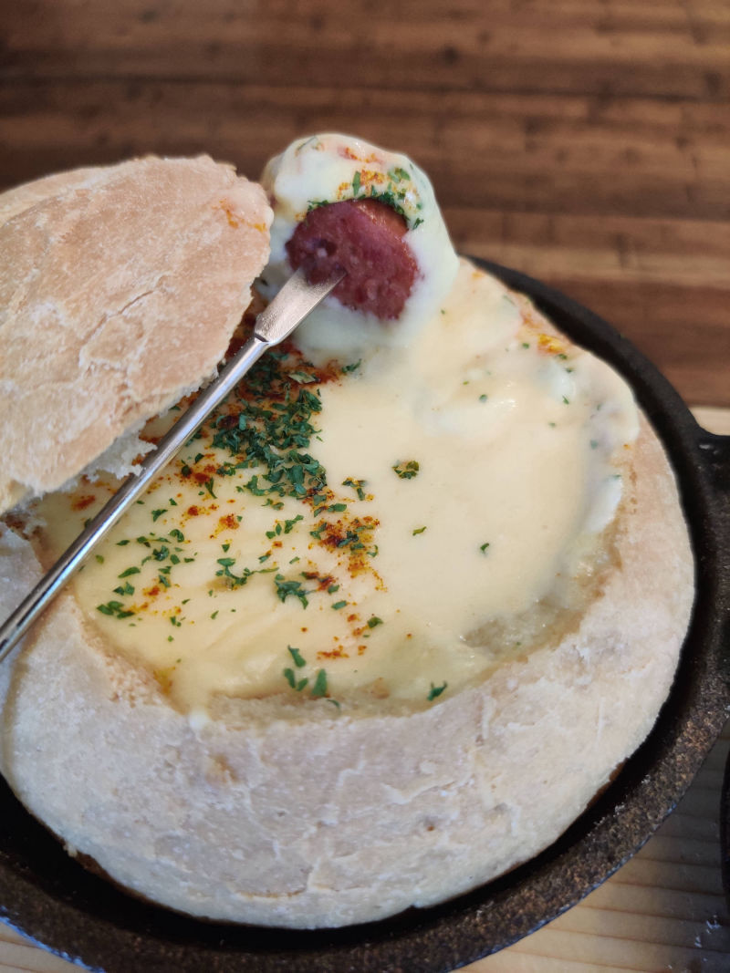 Un reconfortante pan relleno con queso derretido, servido con una variedad de carnes y rodajas de verduras para mojar.