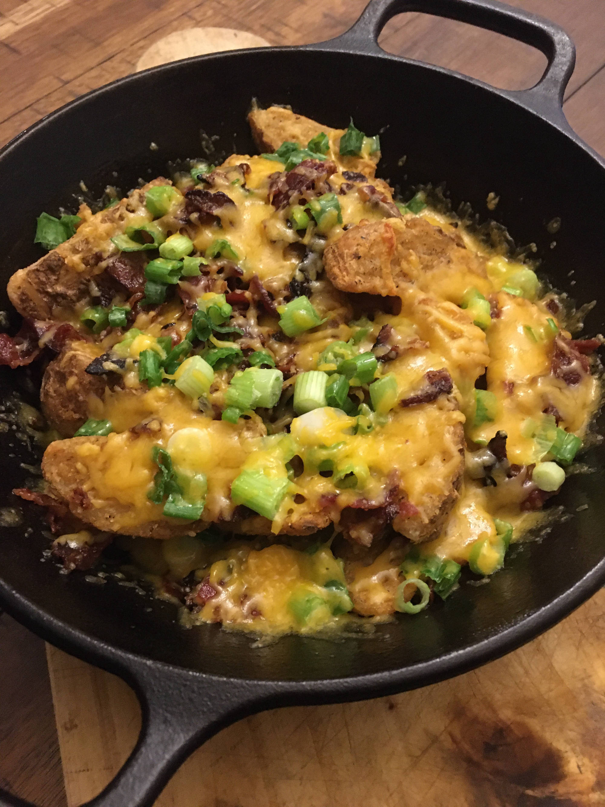 Papas rústicas bañadas en queso cheddar, panceta crujiente y cebolla de verdeo.
